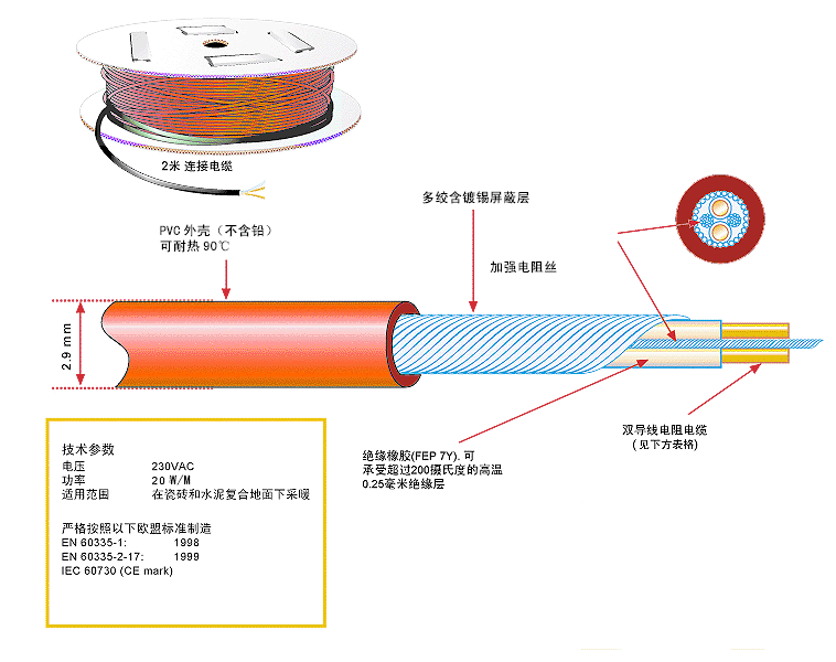 5.0±10%毫米直徑的雙導(dǎo)電地?zé)峋€-新型發(fā)熱電纜,可滿足5毫米-100毫米不同覆蓋厚度設(shè)計(jì)